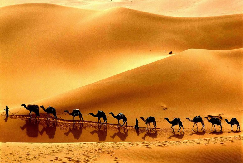 Значительная часть Великого шелкового пути пролегала по пустынным территориям Азии. Для перевозки ценных грузов торговцы использовали в основном верблюдов, которые были как нельзя лучше приспособлены к передвижению по раскаленным пескам.