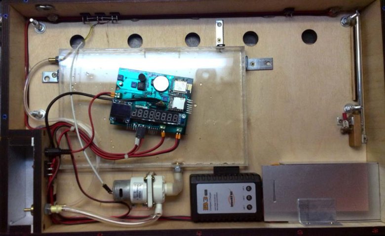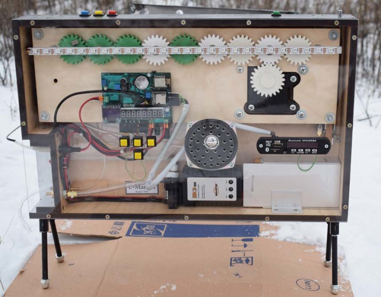 Емкость для воды также была вырезана из акрила толщиной 2 мм с помощью лазерной резки и склеена смесью акриловых опилок с дихлорэтаном. Штуцеры по заказу выточены на токарном станке, смазаны герметиком и установлены в емкость. Насос изначально брал от чайника «термопот», но не устроила его производительность. В итоге применил другой, из Китая. Емкость имеет два штуцера: сливной/наливной и аварийный. Вода наливается через рабочую трубку.