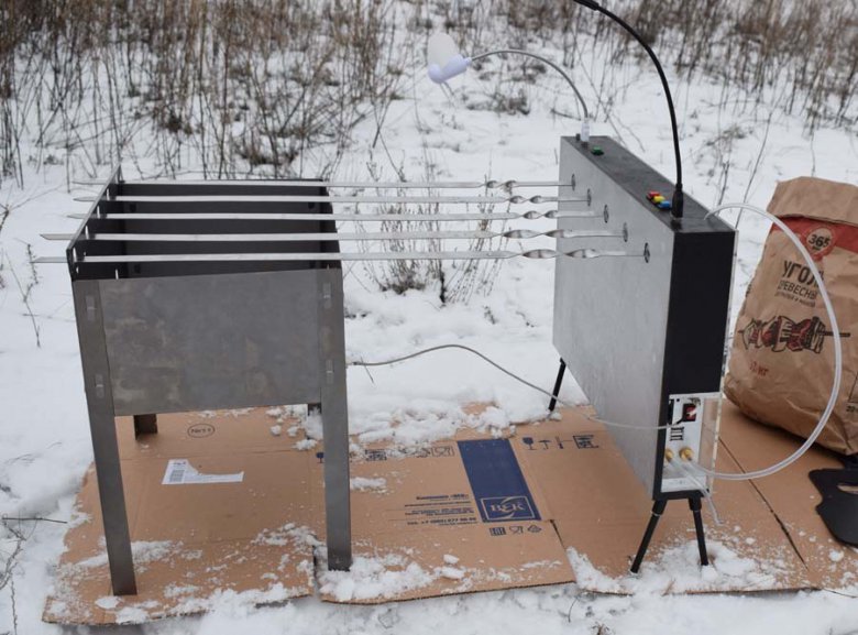 — Вращает шампуры, тем самым равномерно прожаривает мясо;