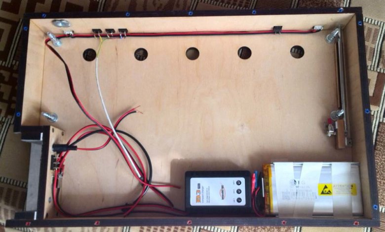 — Так как в одном устройстве сочетаются много функций включая энергоемкое функции заряда внешних устройств, то необходимо было выбрать надежную систему питания. Для этого применил три аккумулятора на 10 А*ч. Аккумуляторы соединены последовательно, тем самым сама система питается от 12 вольт. Зарядка осуществляется через штатное сетевое зарядное устройство-балансир.
