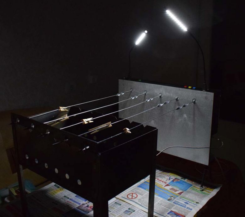 Независимо от режима жарки, можно пользоваться всеми другими функциями устройства. Для подсветки мангала с мясом можно установить внешний светильник в USB-разъем на верхней панели и включить светильник желтой кнопкой или с WEB-страницы. Если есть необходимость в подсветке стола или пространства около мангала, то можно установить еще один фонарь в другой разъем на верхней панели. Также можно освещать зону вокруг E-Mangal и без использования внешних фонарей. Достаточно внутреннюю подсветку перевести в режим белого света. В случае, когда в процессе жарки необходимо дополнительно раздуть угли, то можно установить в USB-разъем верхней панели внешний вентилятор и направить его в сторону мангала.