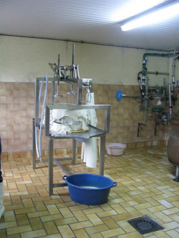 Коров доят два раза в день, молоко сливают в медный чан, добавляют фермент, нагревают, сутки оно киснет, получается консистенция жидкого творога. Потом берут специальную льняную тряпку, набирают в нее этот творог и кладут в форму под пресс. Получилось пять голов сыра. Когда немного полежит, тряпки меняют на сухие и оставляют под прессом на сутки.