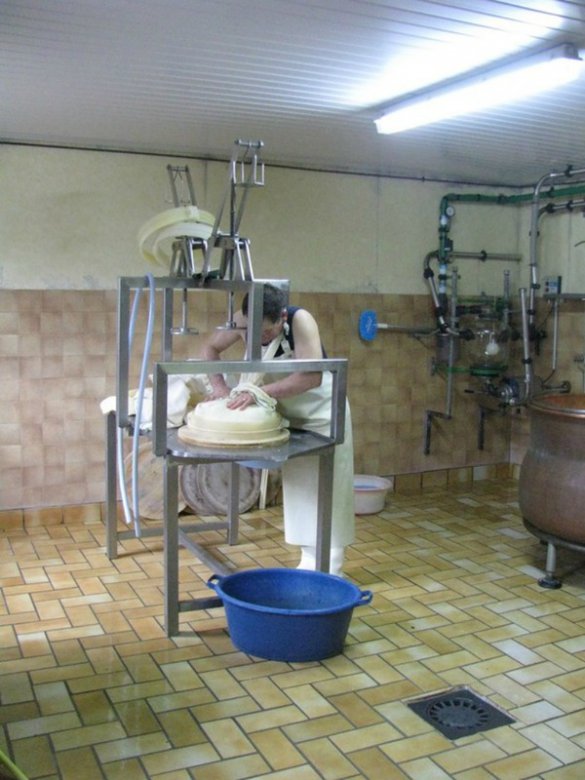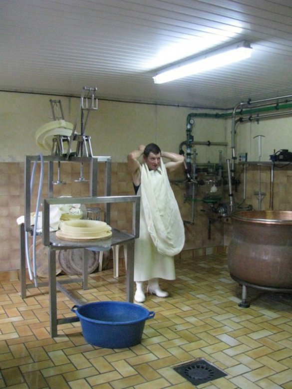 Далее, внимание, каждую голову сыра (около четырёхсот!) каждый день переворачивают. Голова весит от 7 до 12 кг в зависимости от количества выдоенного молока. Некоторые при этом обмазывают крупной солью, а некоторые моют.
