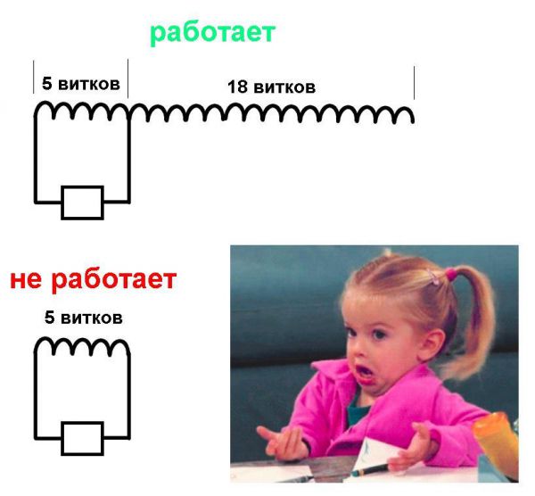 Нафиг, нафиг! Жизнь к таким расчетам меня не готовила! У нас чисто практическая задача. А раз такая странная схема на практике работает (непонятно как правда О_о), то подбор длинны проводника существенно упрощается. Вместо того, что бы перепаивать каждый раз чип, варьируя количество витков, можно просто сделать этот свободный хвост с запасом и отрезать от него по кусочку, добиваясь максимальной дистанции срабатывания.