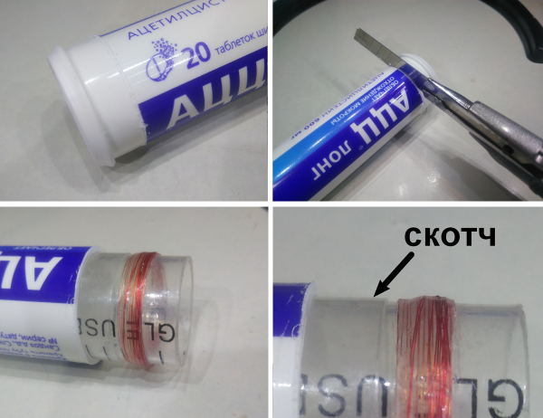 Очень выручили полосочки тонкого двустороннего скотча, при начале намотки и между слоями. Проволока прилипает, не съезжает, не разматывается. Вместо прежних 5 витков получилось 18, плюс лишний кусочек.