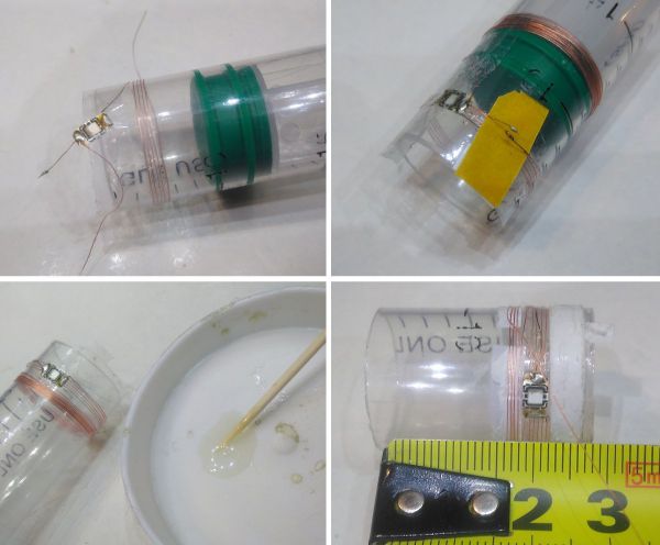 Намотав, начинаем тестировать. На пальце – не срабатывает, снимаешь, подносишь ближе – работает. Потихоньку отрезаю. Сначала по 2-3см и пробую каждый раз. Как только почувствовал, что дистанция срабатывания стала увеличиваться, стал отрезать по 5мм. В итоге выяснялось, что приблизительная резонансная длинна "хвостика" – 1.5м. (около 22 витков)