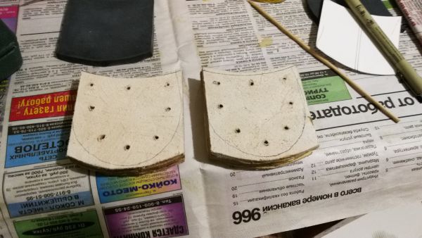 Подготовка наборных каблуков. Несколько склеенных слоев чепрака, усиленных деревянными вставками+резиновая набойка.