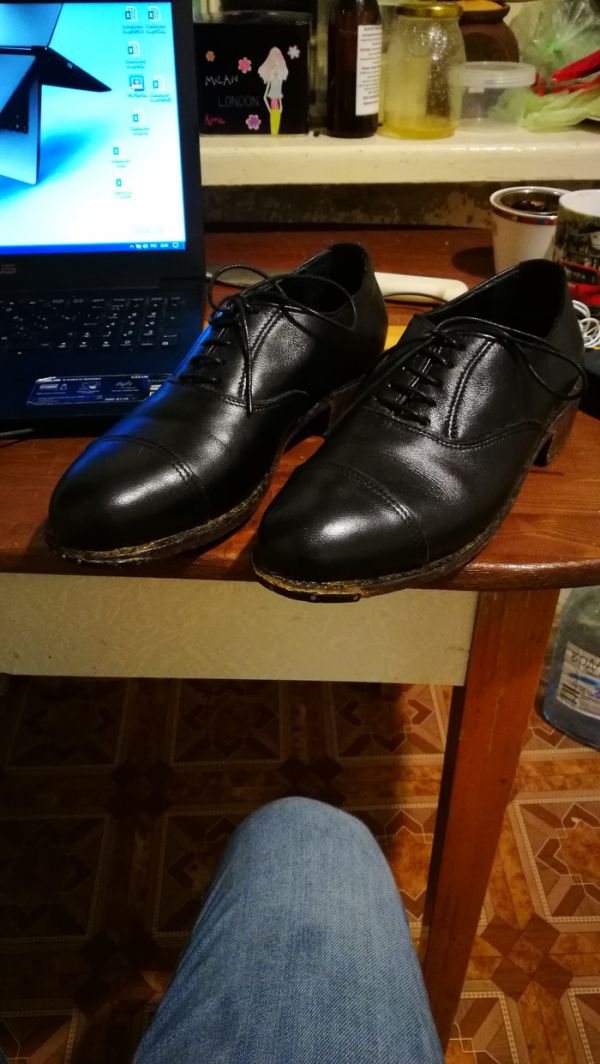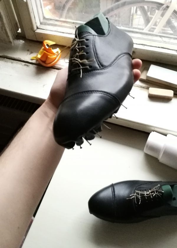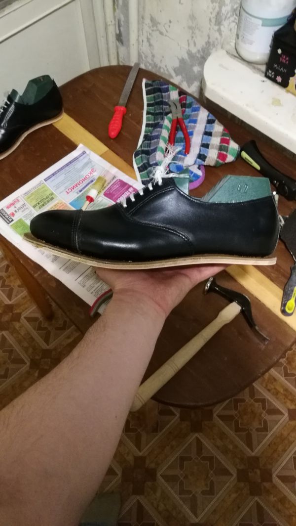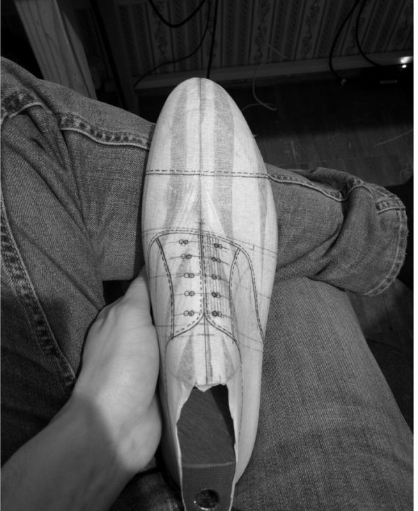 Получив колодки нарисовал на них модель и спустя три недели пота, крови и отбитых молотком пальцев получилась вполне носибельная пара классических оксфордов.