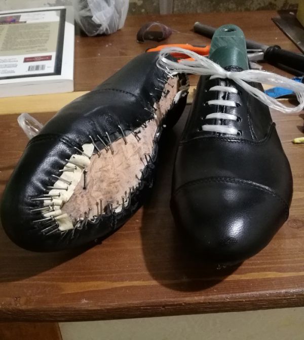 Затяжка верха на колодку. Много гвоздей. Сутки на высыхание клея.