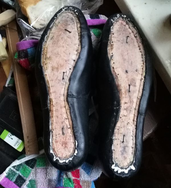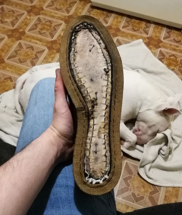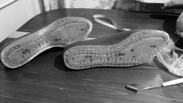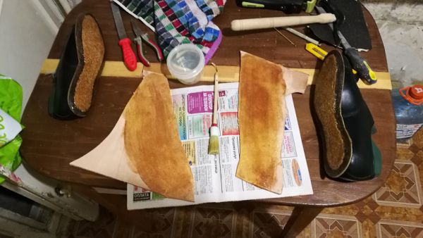 Приклеивание подошвы. Подошва также из чепрака. Клей наирит.
