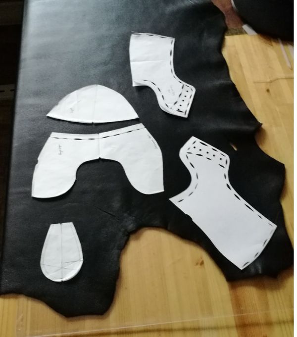Вырезание заготовок из кожи. Верх из овчины, подкладка из козы.