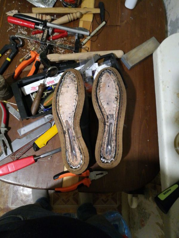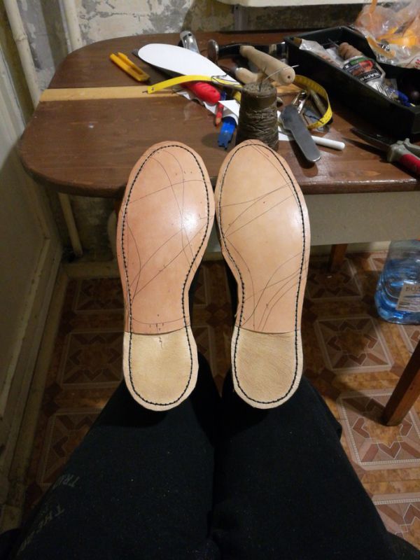 Пришивание ранта. Пожалуй самая трудоемкая для меня операция была, так как делал это впервые и без нужных инструментов. По 1 раб. дню на каждую пару получилось. Это первый, фоткал в 2 часа ночи, собака не дождалась завершения и отрубилась)