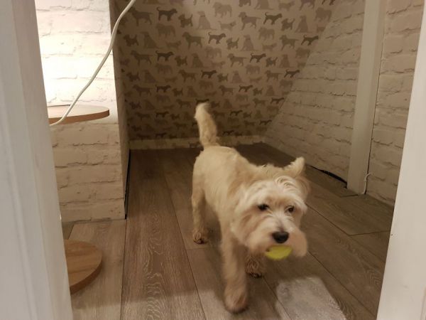 Когда у одной семейной пары появился ребенок, молодые родители стали гадать, что же делать со своим псом, который привык всегда быть рядом? Решили для пса выделить отдельный уголок, под лестницей, но обустроить его так, чтобы пес не чувствовал себя обделенным.