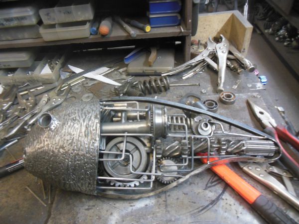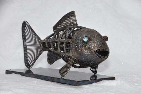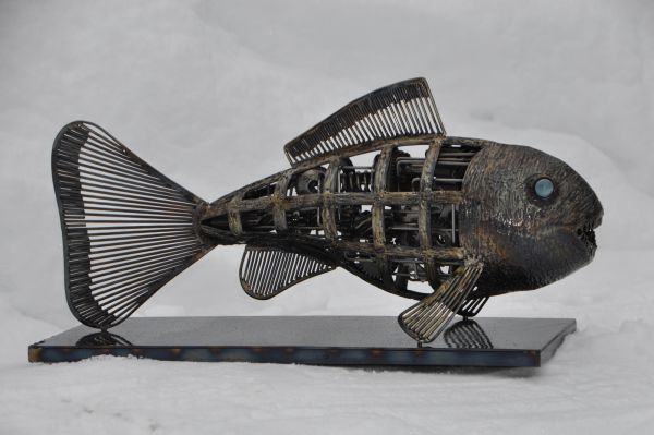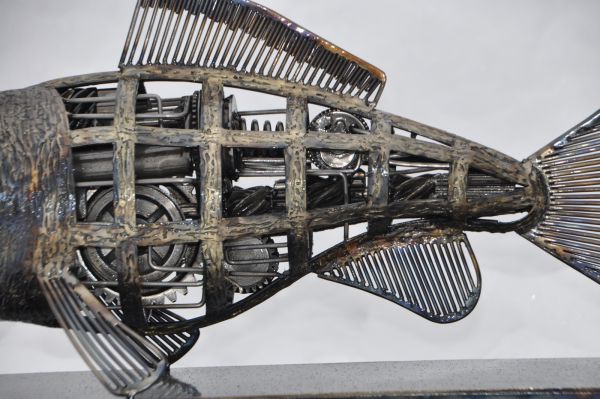 После изготовления всей рыбы вклеил термо пистолетом. Потом хребет и наполняем его всякими шестерёнками.Плавники сделаны из электродов и гвоздей.