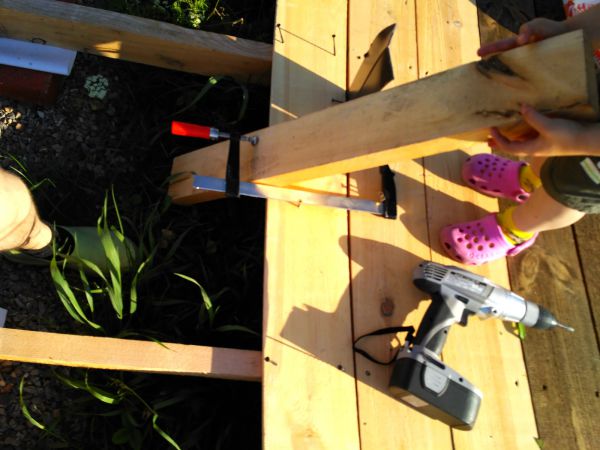 прямо сверху вкручивал несколько саморезов, а струбцину упирал в отрезок бруска, сам брусок я снизу придерживал ногой. На фото его держит мой детеныш, это просто чтобы сфоткать конструкцию. А так все делал один. Саморезы под углом в лаги вкручивал, если собираетесь подобным заниматься советую по мощнее шуруповерт выбирать, у меня 18 вольтовый, тяжелый собака, но вкручивает все подряд, бывает саморезы ломаются.