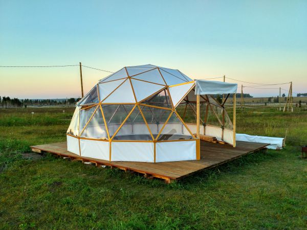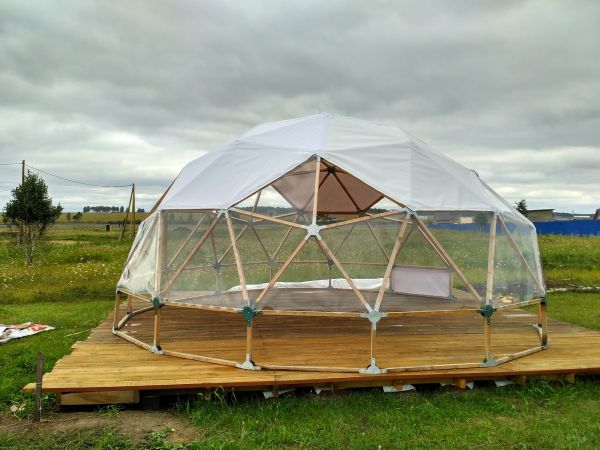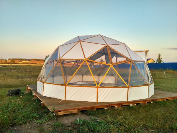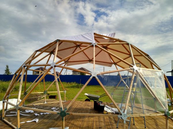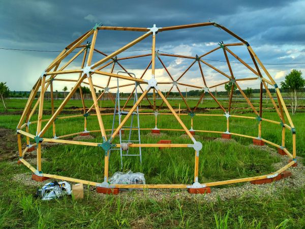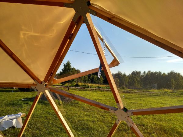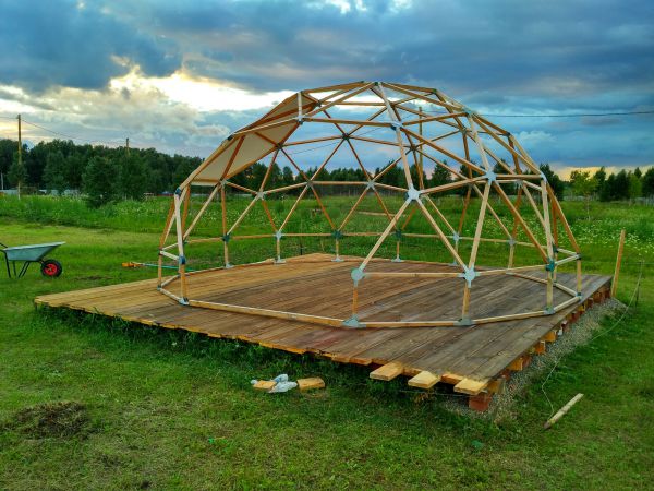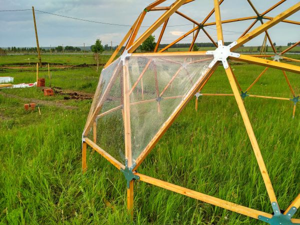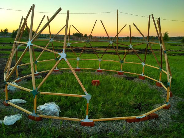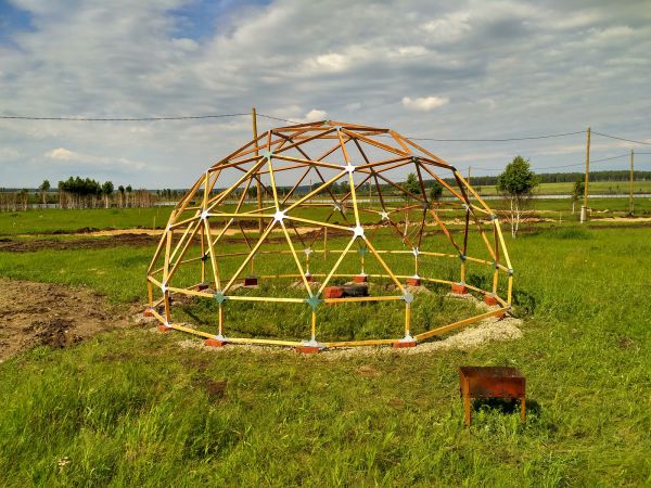 Если собираетесь строить купол, нужно сразу определиться с соединениями, если это коннекторы, то их много разновидностей и нужно выбирать, что под силу именно вам и в вашем городе найдется материал. В комментариях упоминали круглые трубы сплюснутые на краях, я думал о таком способе, но нужна оснастка для пресса иначе труба может лопнуть, концы получатся под разными углами, короче не моя тема, нужно заказывать такие детали у кого то. Опять же купол я просто пристрелял на скобы, а тут надо его склеить на земле, потом надевать, привязывать. А так да, смотрится здорово.
