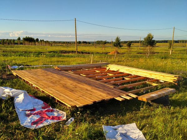 Затем я понял, что умру пилить столько досок для пола, электричества еще не было на участке. А пол я хотел круглый. Думал пустить лаги от середины к углам беседки и доски также выложить от середины.