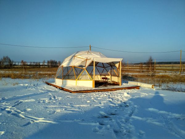 Что получил в итоге: конструкция очень прочная , я по ней спокойно хожу без лесенки, просто по ребрам. От ветра защищает. Зимой приезжали в ней реально немного теплее, чем снаружи, хотя вход 2,5х2 метра. Места внутри очень много. Выглядит круто, особенно в пустом поле.