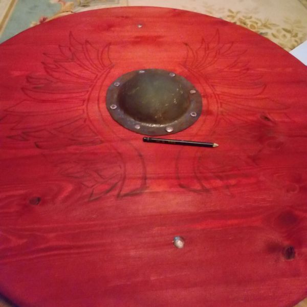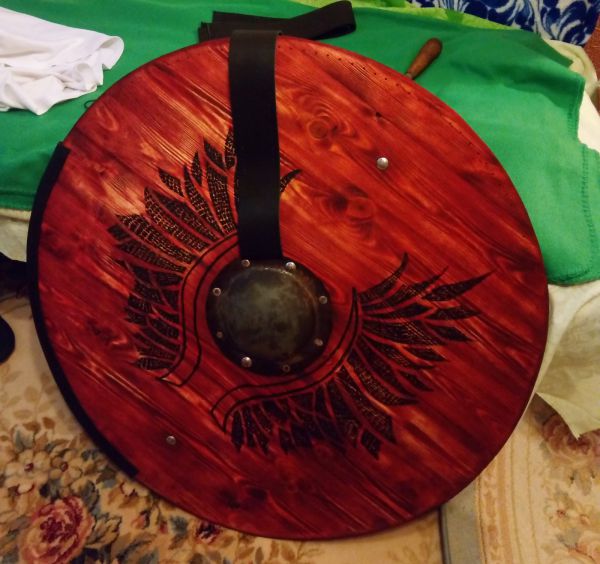 Так как тема щита - валькирия, набросал подобие крыльев (нашёл в интернете похожую картинку с эскизом татуировки). На фото щит уже покрыт морилкой - махагон.