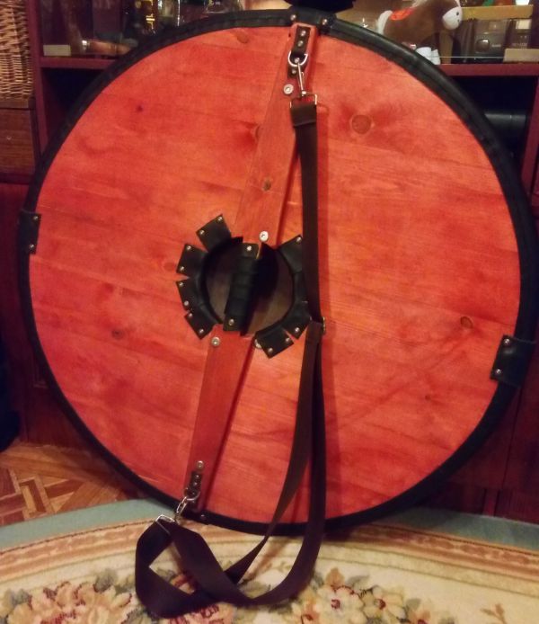 Вот так выглядит щит с обратной стороны. Данная лямка пока временная, скорее всего позже, как появится подходящая кожа, сделаю ремень для переноск
