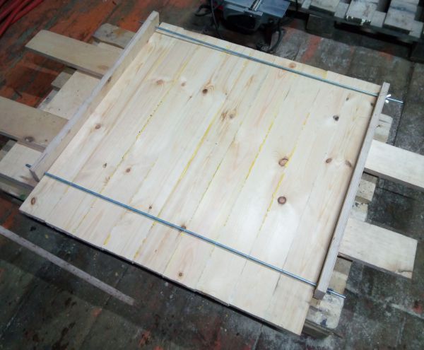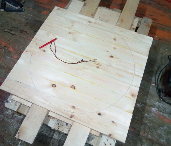 Купил хороший столярный клей, соорудил небольшую приблуду для склейки досок из двух кусков фанеры и шпилек. Доски распилил на фрагменты длиной 90 см, не очень экономно, но мне так было удобней, чтобы запас был больше при вырезании окружности