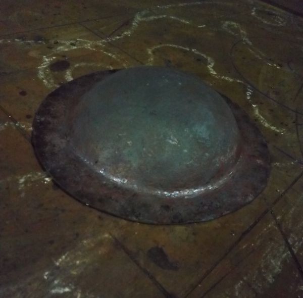 Из листа вырезал окружность (около 21 см), нахошёл подходящую по диаметру трубу и вытянул полусферу. В процессе немного подогревал заготовку в горне. Пользовался чуток закругленным молотком (доработал болгаркой) и половиной советской гантели в виде шара. Первый умбон я порвал (скорее всего из-за проржавевших участков), а вот второй вышел неплохим. Глубина около 5 см.