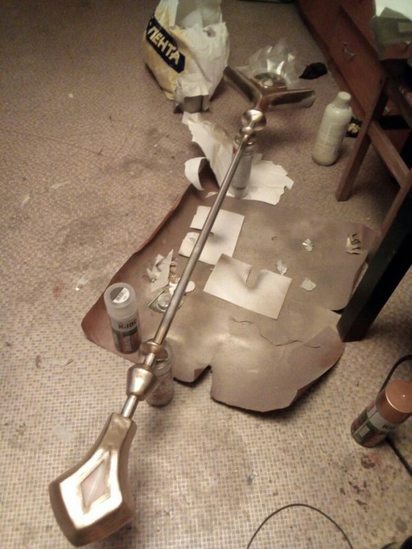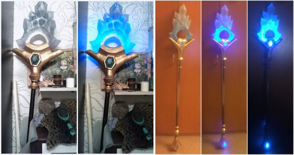 В палке надо сделать отверстия под кнопку и кристаллы, чтоб вывести проводку.