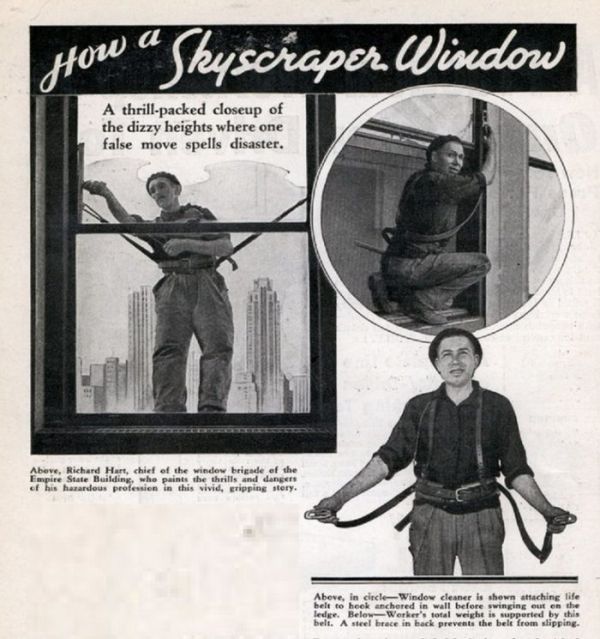 В 1934 году начальник бригады мойщиков Эмпайр-стейт-билдинг Ричард Харт в интервью американскому журналу "Modern Mechanix" рассказал о своем 65-летнем сотруднике, который всю жизнь занимался только окнами и наконец решил уйти на покой. Через день он попросился обратно, сказав что ему очень не хватает головокружительной высоты и захватывающих дух видов, к которым он привык. С годами высота впитывается в вашу кровь, сказал Харт, и вы уже никогда не сможете работать на земле. Работа мойщиков считалась довольно престижной и неплохо оплачивалась.