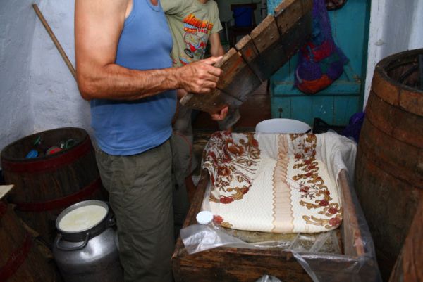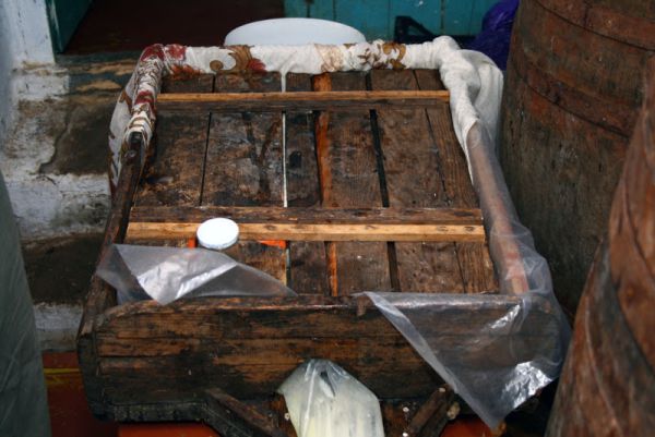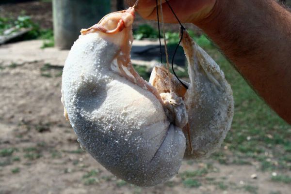 Тут хранится закваска для брынзы. В желудочке десятидневного ягненка. Жестоко, но это проза жизни. Ягненок забивается, после чего аккуратно вырезается желудок и в его содержимое добавляется приличное количество соли. Хранится на открытом воздухе месяцами. Одной ложки хватает для заквашивания до 100 литров молока.