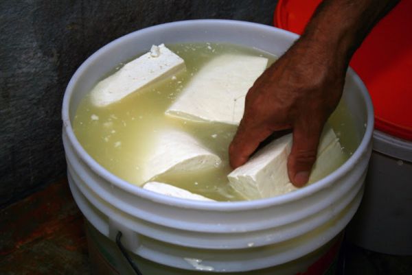 Обильно присыпаем солью и на несколько дней оставляем в тазу. Темноватые следы на брынзы - каменная соль, на качестве продукта это не отражается