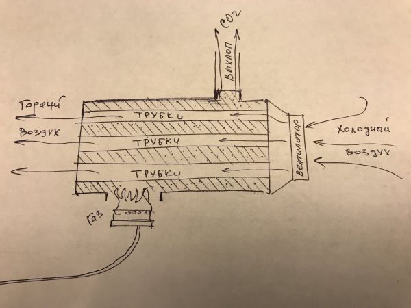 Схематично, но думаю понятно. Горелка нагревает трубки, воздух, заходя с одной стороны холодным, нагреваясь, выходит с другой стороны горячим. А СО2 выходит через выхлопную трубу на улицу. В итоге воздух в салоне чистый, теплый. Нет риска угареть и отравиться. На фото теплообменник без вентилятора.