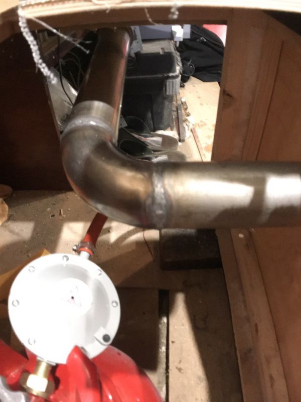 Выхлоп выходит под сидушкой. Температура трубы в этом месте еще горяча, но уже рука терпит. Но все же первое колено решил сделать из нержавейки. На всякий случай.