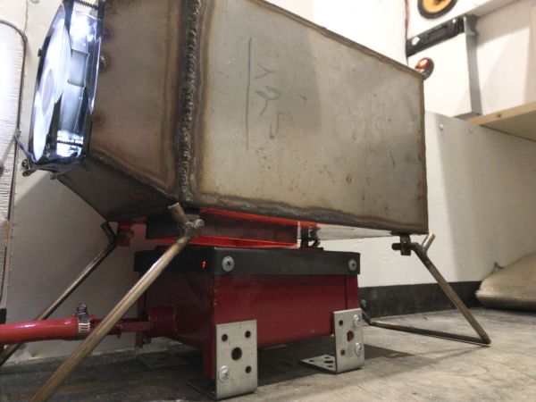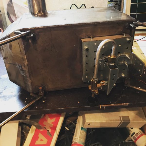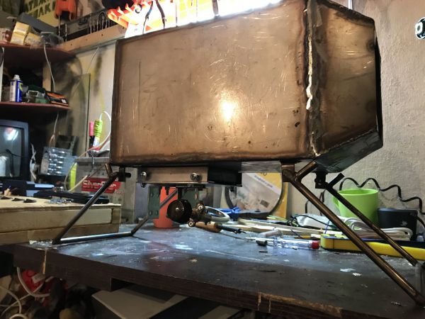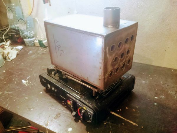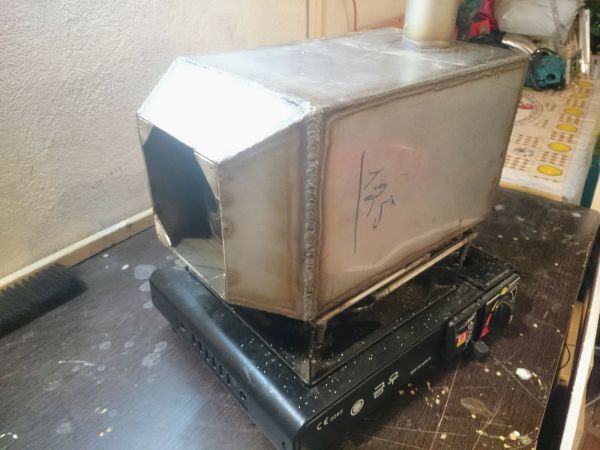 Что это такое? Это стальная коробка, с ввареными насквозь трубками. Снизу в камере сгорания отверстие для горелки, сверху - выхлопная труба. Всасывает воздух вентилятор от компа 12В.