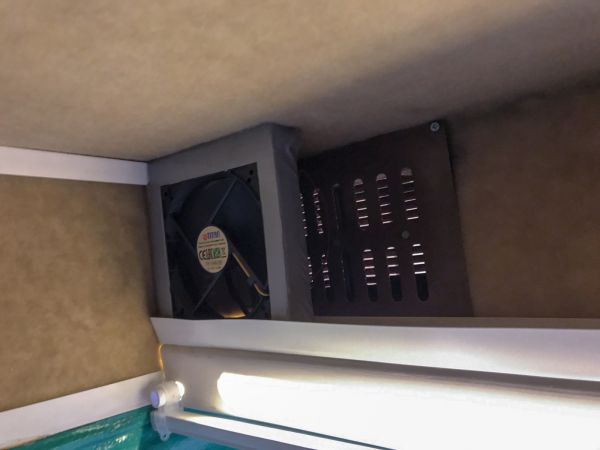 Снизу у двери у меня приточка свежего воздуха, а сверху под потолком принудительная вытяжка. Тот же вентилятор от компа 12 В. Потребление таких вентиляторов 0,3 А. Просто ничтожно.