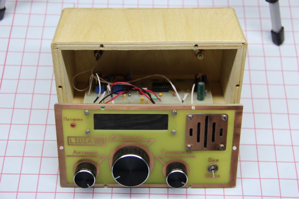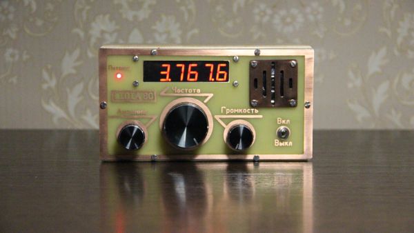 И вот все в сборе. Принимаемые частоты от 3.6 до 3.76 МГц. Это соответствует голосовому участку диапазона 80 м. Кроме громкости и частоты есть регулировка уровня сигнала антенны. В качестве антенны провод спущенный с пятого этажа до уровня первого. Городские условия далеко не идеальны для приема в КВ диапазоне, но тем не менее приемник показал себя неплохо. Пример работы в видео.