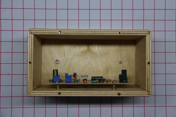 Задняя крышка изначально была вырезана немного большего размера и после склеивания была обработана обгонной фрезой. Это позволяет не вымерять размеры детали, а подогнать ее уже по факту размера корпуса. Очень удобно. Два слоя акрилового лака и коробка готова.