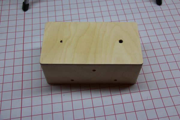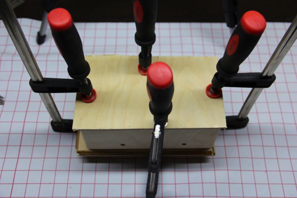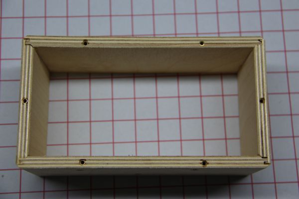 Корпус по традиции из фанеры. Для соединения была использована фреза углового сращивания. Она позволяет стыковать заготовки под углом 90 градусов, а благодаря бОльшей склеиваемой поверхности соединение получается крепче. Для крепления "морды" я использовал латунные врезные гайки, для уверенности посаженные на клей.
