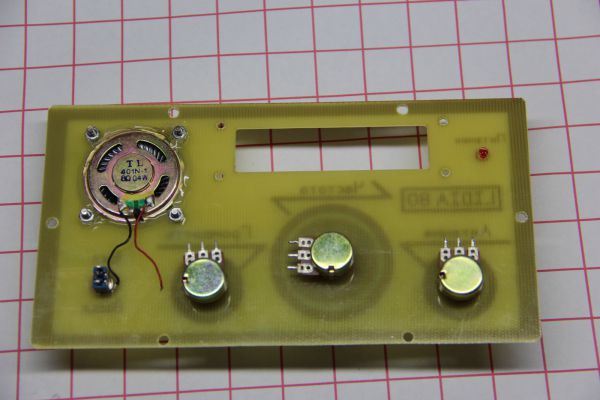 Вот так выглядит морда в сборе. В качестве светофильтра использована пленка для принтера с нанесенным тонером. Малогабаритный динамик был взят из нерабочего приемника. Для настройки на частоту в идеале нужно использовать многооборотный резистор. У меня была пара таких резисторов, но они оказались плохого качества. Контакт внутри был плохой и из-за этого частота постоянна скакала. Пришлось использовать обычный резистор, а плавность настройки компенсировать увеличением ручки.
