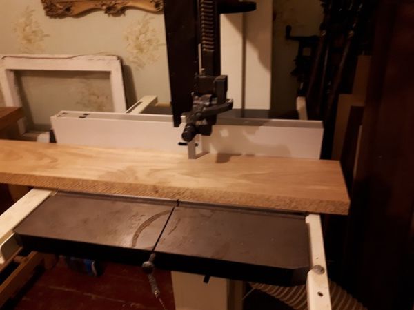 Распил дубовой доски ленточной пилой на ламели.