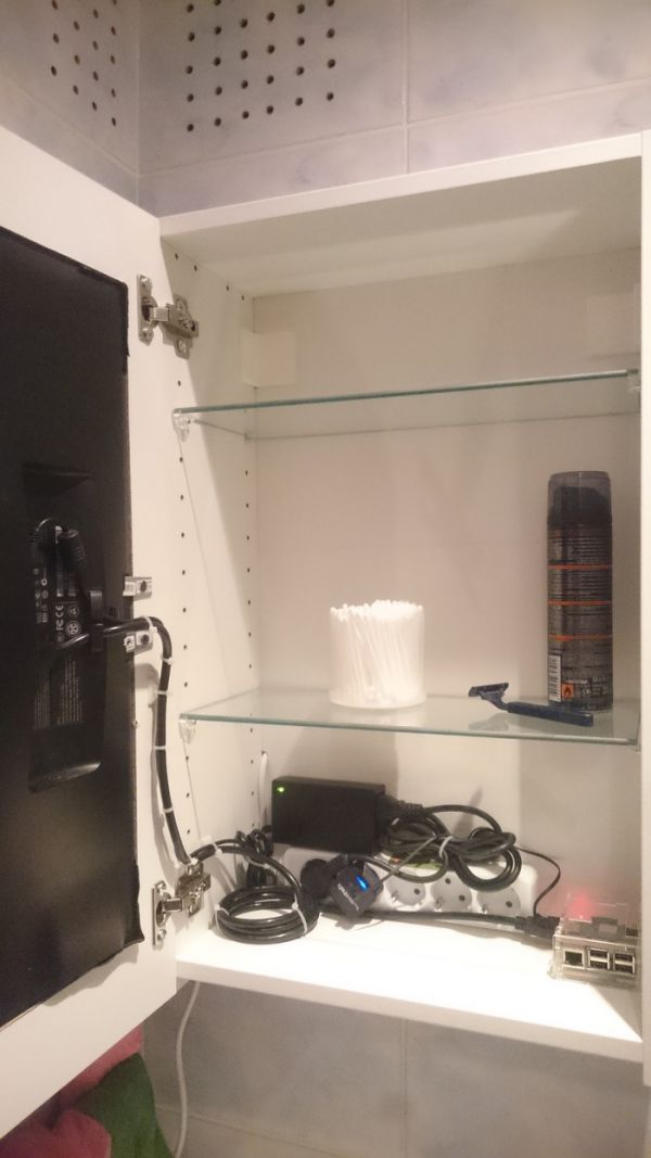 Ещё раньше, в процессе поиска зеркала, была куплена Raspberry Pi 3 model B, б/у монитор 24" с косячком на матрице, на который мне, ввиду сокрытия монитора за зеркалом и тёмного интерфейса совершенно побоку, шкафчик в ванную комнату в одном малоизвестном скандинавском магазине (под размер его дверцы и бралось зеркало), ну и всякая мелочёвка а-ля HDMI кабель, БП для малины и датчик движения, о нём позже.