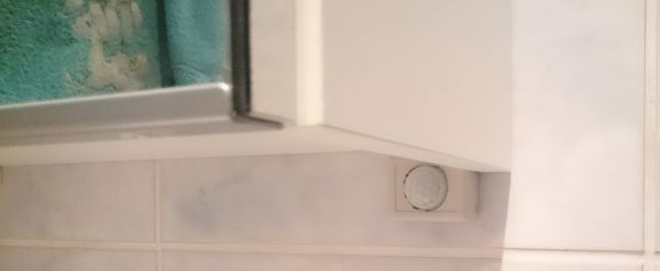 Да, кстати, о датчике движения. Вот он, притаился внизу. Зачем монитору гореть весь день, даже когда в ванной никого нет. После небольшой настройки прекрасно выполняет свою функцию - гасит моник через 20 секунд после того, как вы вышли и зажигает при появлении.