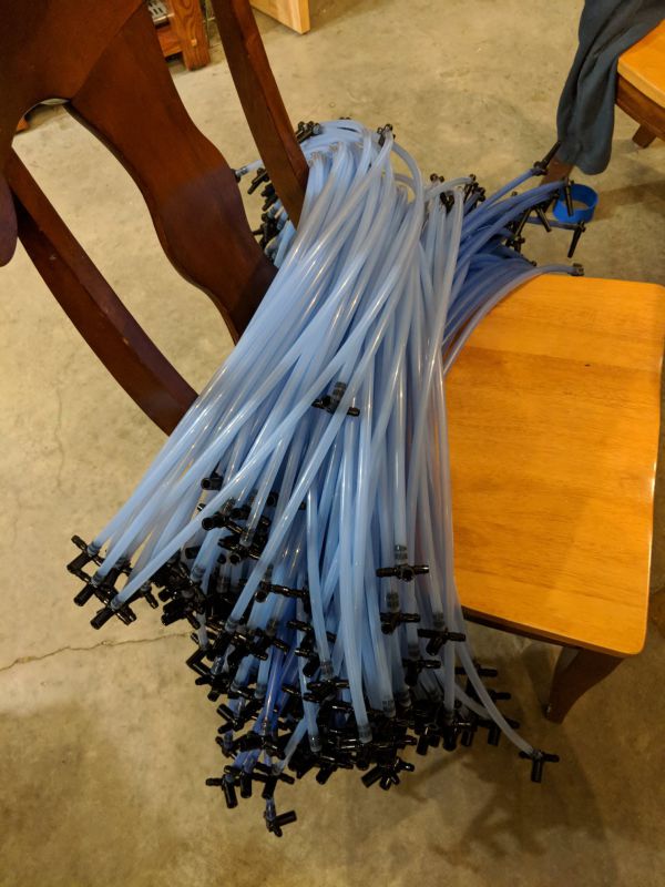 Первым делом подготавливаются 200 приспособлений для добычи сока, каждое из которых состоит из метрового шланга и краника. После завершения сезона откачки сока каждый шланг промывают с помощью 3%-го раствора перекиси водорода и закрывают колпачками, чтобы он оставался чистым внутри.