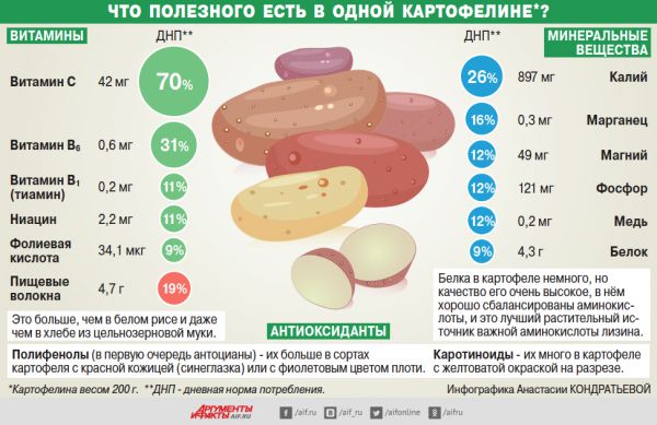 Дотошные американцы посчитали, что в составе картофеля они потребляют 25% всех полифенолов — полезнейших антиоксидантов, защищающих сердце, сосуды, препятствующих старению и развитию рака.