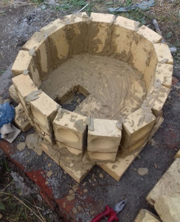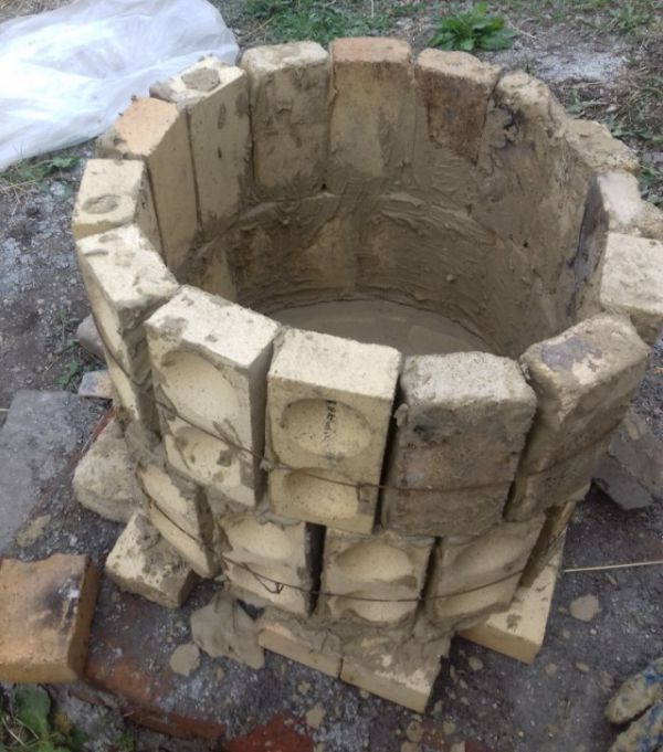 Первый ряд пошел. Окружность соблюдал на глаз, подравнивал пока раствор сырой. Кирпич кстати надо смачивать, а то всю воду кирпич из раствора забирает. Стянул вязальной проволокой, чтоб не расползалось пока раствор сырой.