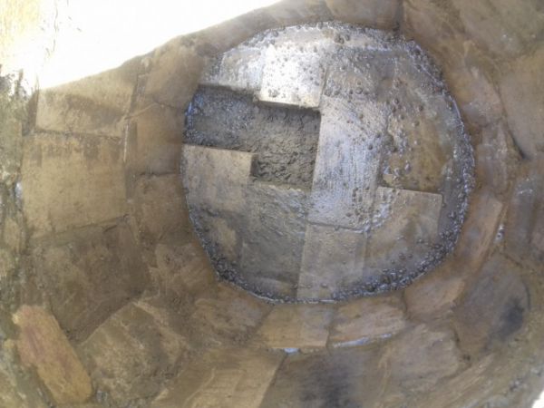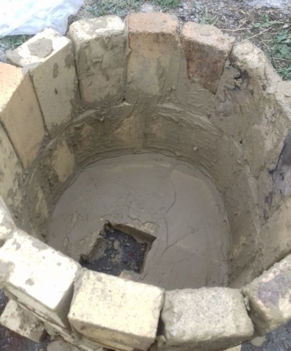 Верхний ряд собирал из половинок . Остались ток они докупать не хотел, и легче сужение в верху делать. Снаружи обмазал остатками раствора с добавкой цемента. Сушим.