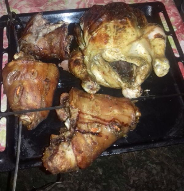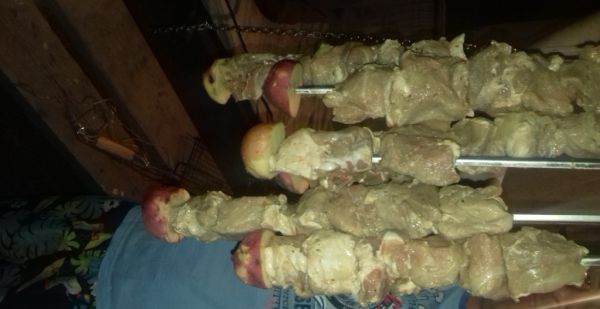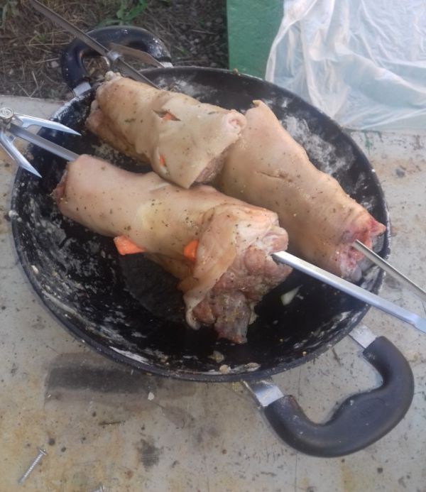 Рульки замариновал в пиве и специях. Нашпиговал морковкой и чесноком. Насажаны на простые шампура.