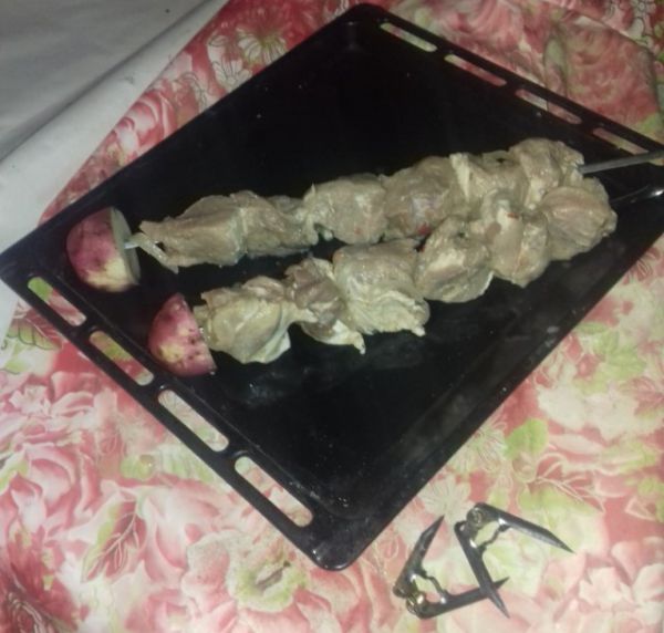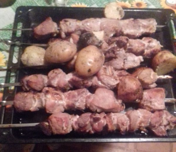 Купил тарелку и нержавейки и простые шампуры, скорее даже проволоку из нержавейки. Соорудил вот такую подставку- внизу в тарелке свежий картошка. Потом елку сварю, прикольная штука.