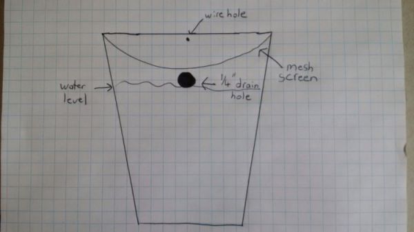 Просверлите маленькие отверстия вверху, чтобы сквозь них могла пройти проволока. Ниже, на высоте около 80% высоты контейнера, просверлите отверстия диаметром около 6 мм. Они необходимы, чтобы уровень воды не был выше металлической сетки, которую вы вставите позже.