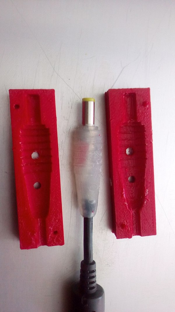 После того как напечатало форму, я ёё смазал вазелином, вложил заранее перепаянный штекер (для ноута ASUS) и скрепил две части вместе. Обмотав банковскими резинками для денег. Залил через ОТВЕРСТИЯ горячий силикон из клеевого пистолета. Оставил остывать на час.