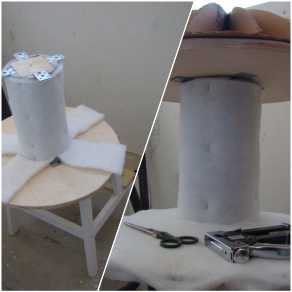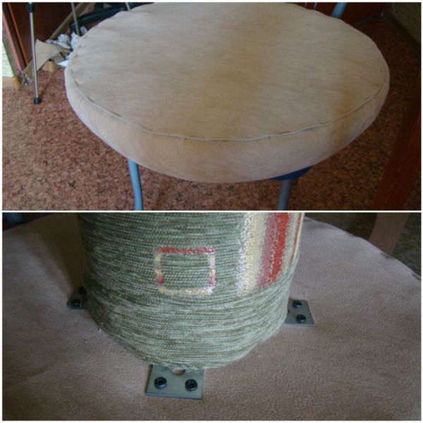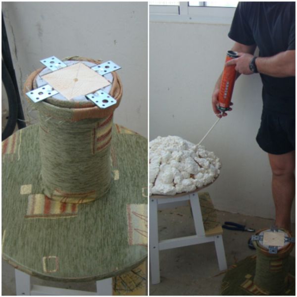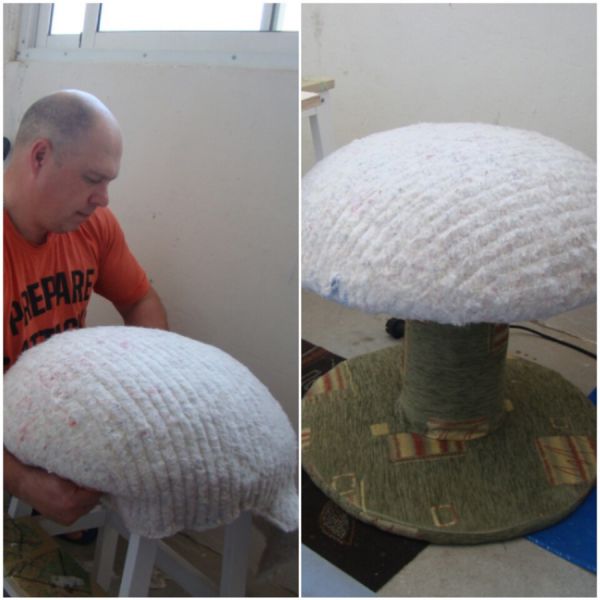 Сшил чехол из имеющегося в запасе гобелена. Одел на конструкцию. Запенил шляпку строительной пеной.